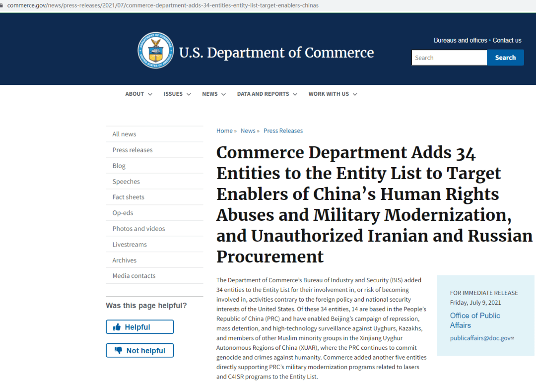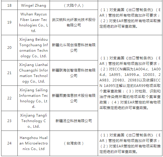 就在這個月的7月12日,美國商務(wù)部產(chǎn)業(yè)與安全局(BIS)通過《聯(lián)邦政府公報》(Federal Register)發(fā)布了一項最終規(guī)則(final rule),來自中國的24個實體/個人從事或促成了有違美國國家安全或外交政策利益的活動,因而將其列入“實體清單”。被列入清單的理由、列入后的許可要求和許可審查政策如下。