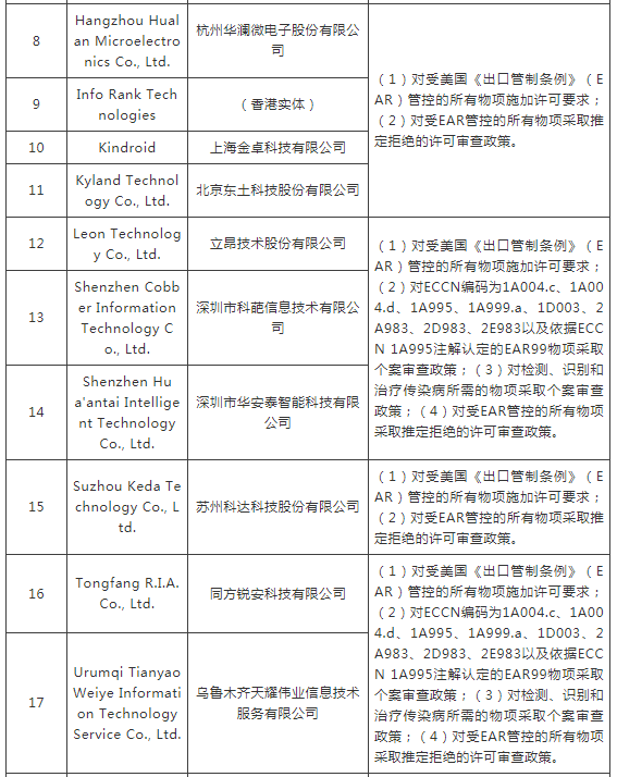 ERC認定以下實體與所謂“中國在新疆的侵犯人權(quán)行動”有牽連,違反美國外交政策,將其列入“實體清單”。