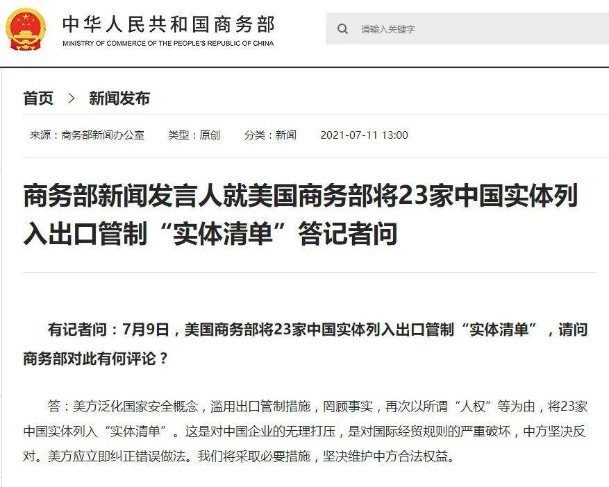 7月9日,商務(wù)部新聞發(fā)言人就美國商務(wù)部將23家中國實體列入出口管制“實體清單”答記者問:美方泛化國家安全概念,濫用出口管制措施,罔顧事實,再次以所謂“人權(quán)”等為由,將23家中國實體列入“實體清單”。這是對中國企業(yè)的無理打壓,是對國際經(jīng)貿(mào)規(guī)則的嚴重破壞,中方堅決反對。美方應(yīng)立即糾正錯誤做法。我們將采取必要措施,堅決維護中方合法權(quán)益。