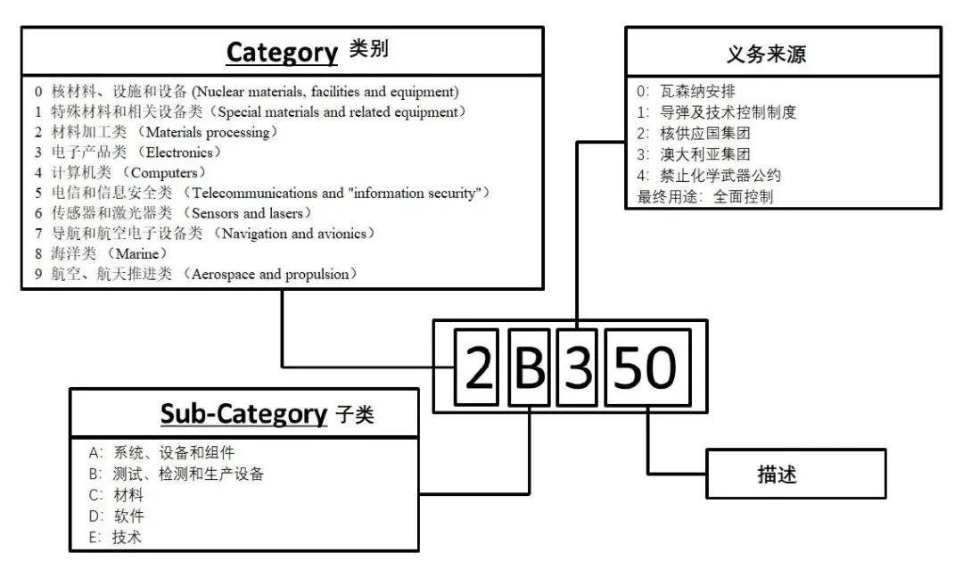 歐盟出口管制物項ECCN的第一、第二位數(shù)字排序與美國ECCN一致,都延續(xù)了《瓦森納協(xié)定》的規(guī)定。第一位數(shù)字為物項的分類,分為0~9類物項;第二列數(shù)字為物項的種類:A代表“系統(tǒng)、設(shè)備和部件”,B代表“測試、檢查和生產(chǎn)設(shè)備”,C代表“材料”,D代表“軟件”,E代表“技術(shù)”。后三位是對產(chǎn)品的描述,其中歐盟ECCN第三位數(shù)字指明該物項出口管制的義務(wù)來源,說明是出自何種國際共識。